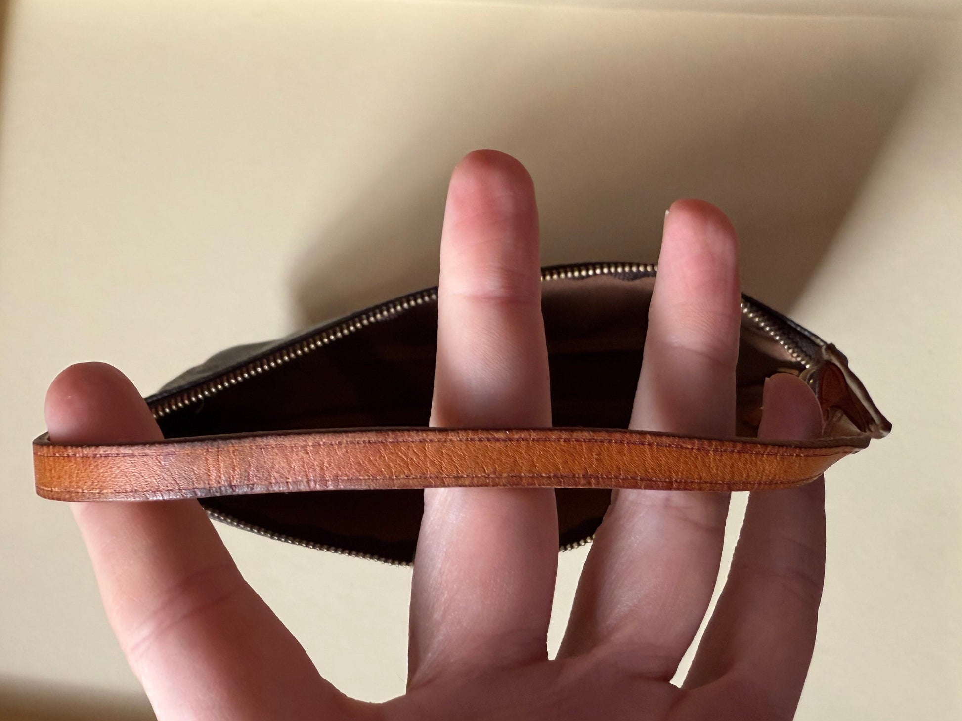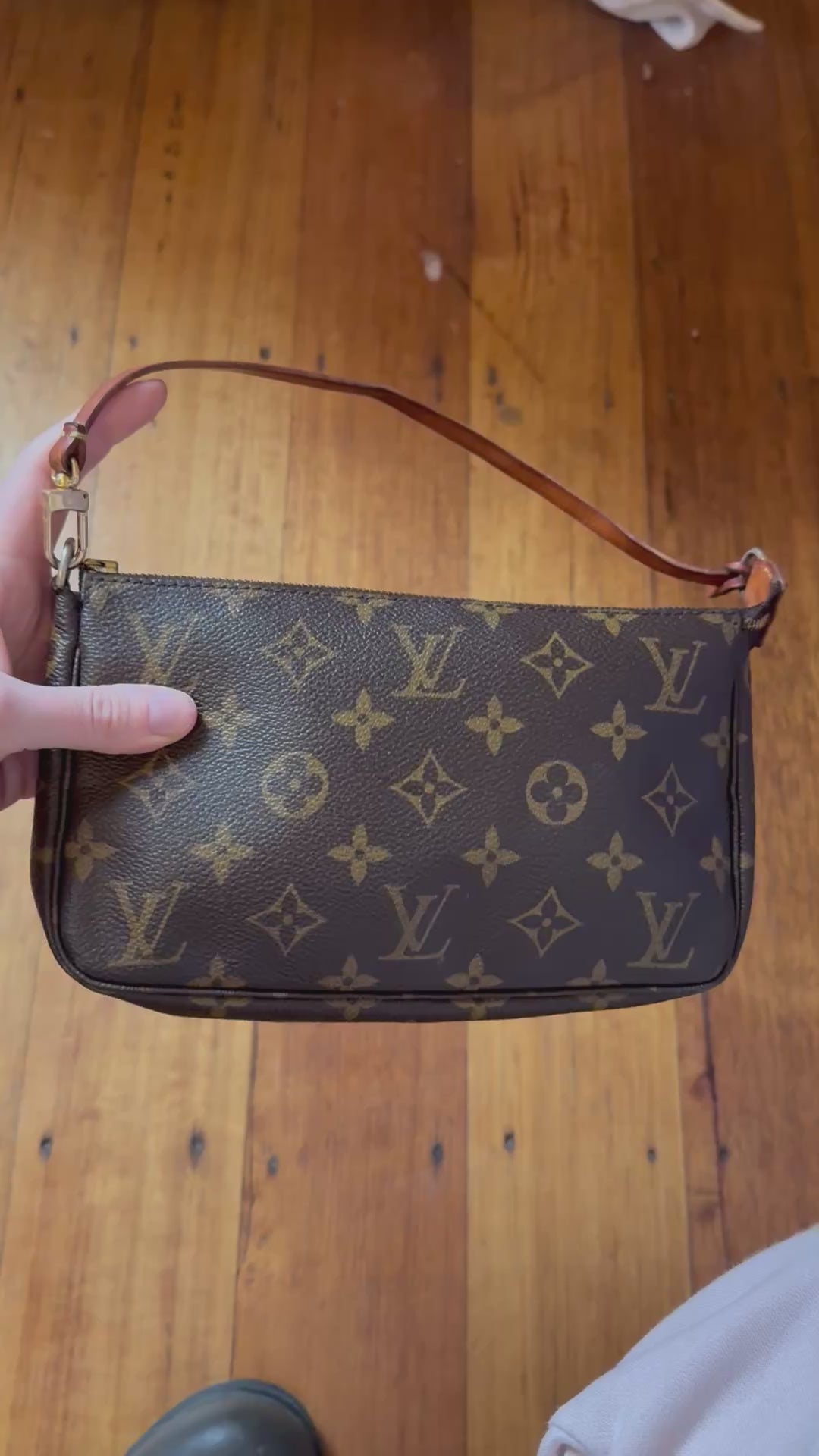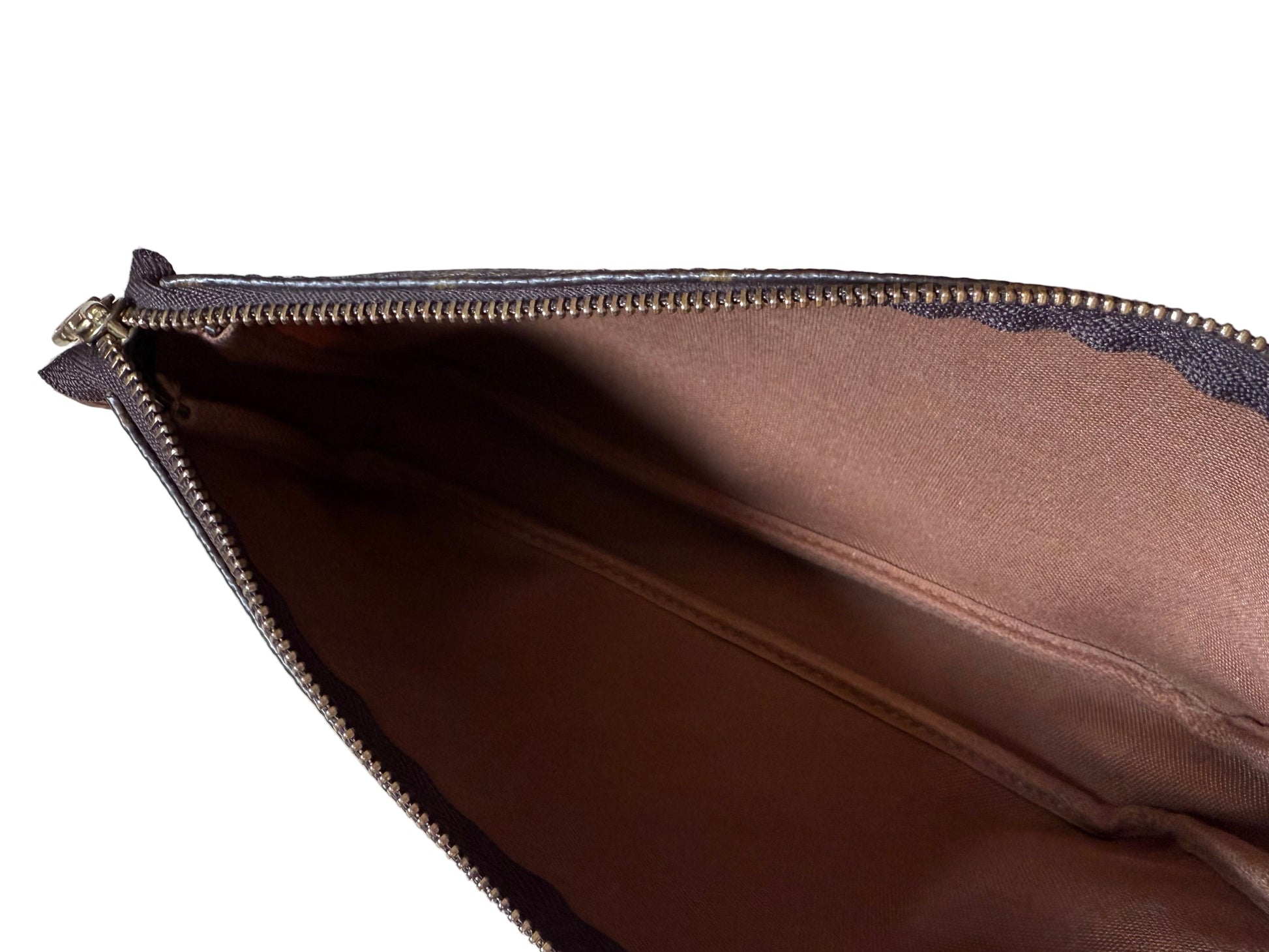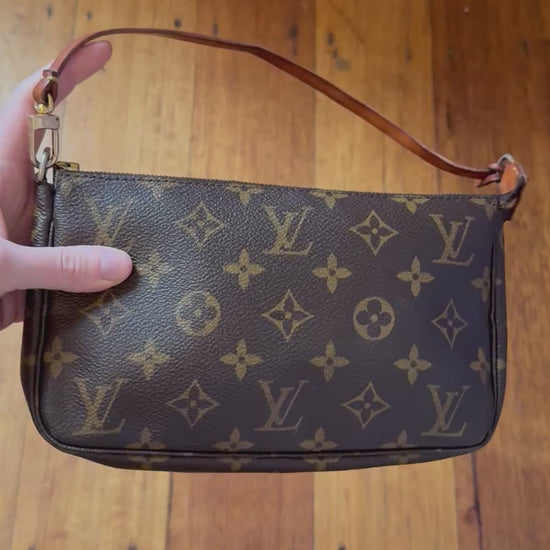 Originally introduced in the late 1990s, the Pochette Accessoires quickly became one of Louis Vuitton’s most sought-after designs. The compact silhouette features a natural honey patina on the leather strap, a hallmark of authenticity and age, paired with gold-tone hardware engraved with the classic LV hallmark.